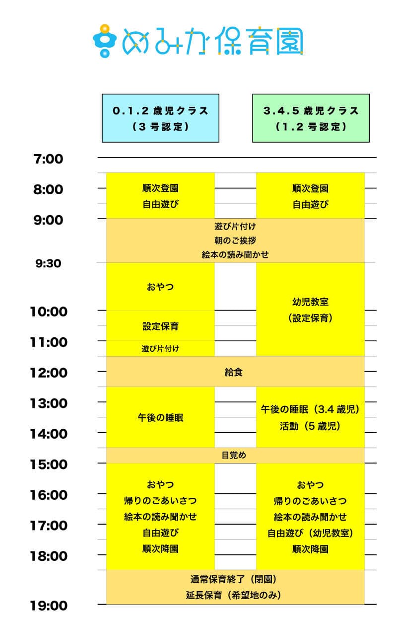 HOME | めみか保育園 | 園での生活 園での1日 PHILOSOPHY 年間行事 EVENT ※予定に変更がある場合は、決まり次第各月おたよりにてお知らせいたします。 ●4月~6月 入園式(3~5歳児) 内科検診 保育参観 消防訓練 歯科検診 ●7月~9月 運動会 プール開き 七夕 お泊まり保育(3~5歳児) ●10月~12月 内科検診 親子遠足 落ち葉拾い クリスマス会 冬休み【12月29日~1/3まで】 ●1月〜3月 お餅つき 発表会節分豆まき 修了写真撮影 老人ホーム訪問 お別れ遠足 卒園式(3~5歳児) 関連施設のご紹介 GROUP
